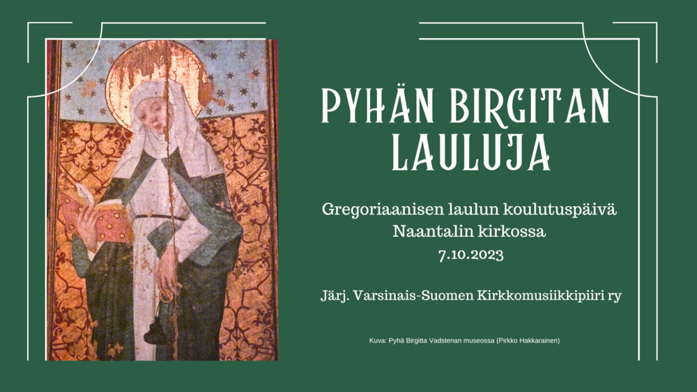 Jo kolmatta kertaa Varsinais-Suomen kirkkomusiikkipiiri ry järjestää gregoriaanisen laulun koulutuspäivän Naantalissa lauantaina 7.10.2023. Tämän vuoden koulutuspäivää vietetään Pyhän Birgitan juhlavuoden teemalla, jonka puitteissa Turun Pyhiinvaelluskeskus järjestää samana päivänä myös pyhiinvaelluksen Turusta Naantaliin.